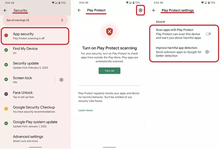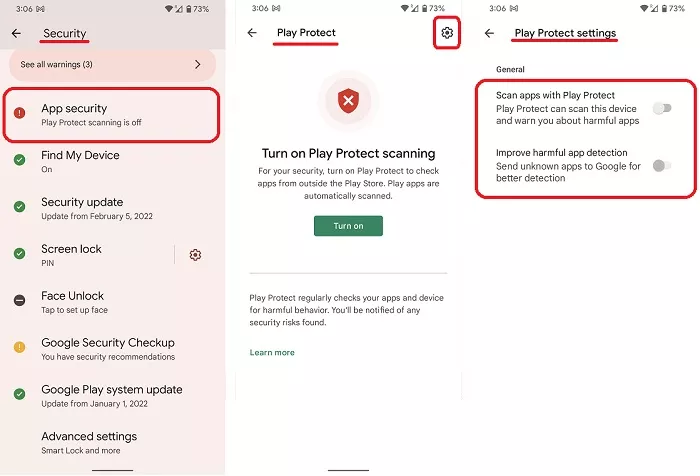 Settings > Google > Security > Scan device for security threats and Improve harmful app detection (1,2,3)