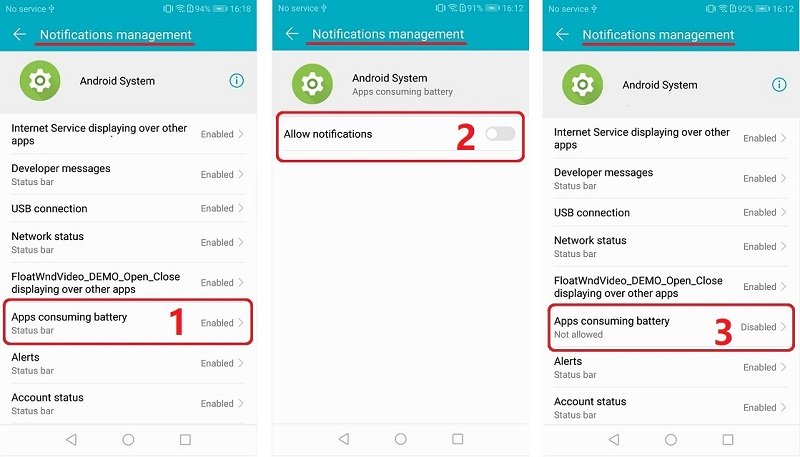 1. Settings > Apps & notifications > Apps > More > Show system processes > Android System > Notifications > Notifications management > Apps consuming battery > Allow notifications (1,2,3)