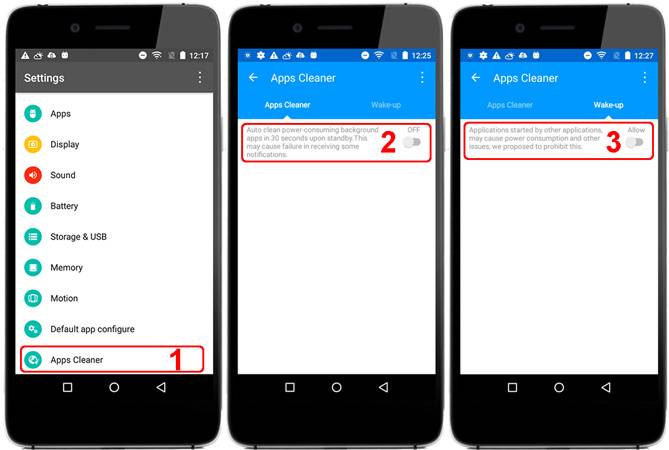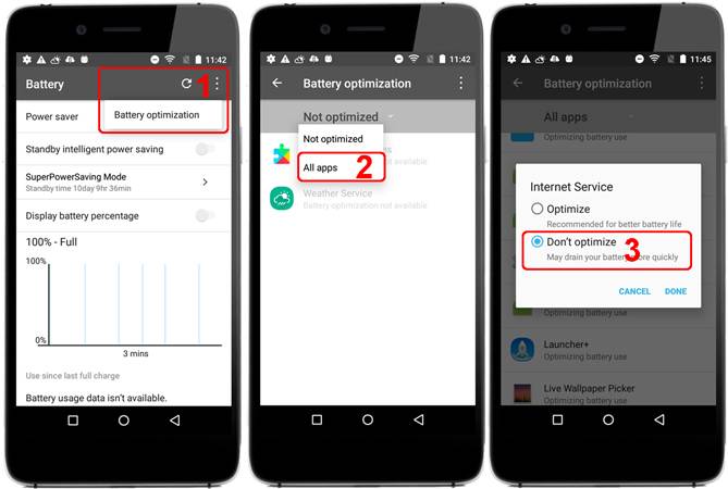 - Settings > Battery > Three dots Icon > Battery optimization > All apps > Internet Service > Don’t Optimize (1,2,3)