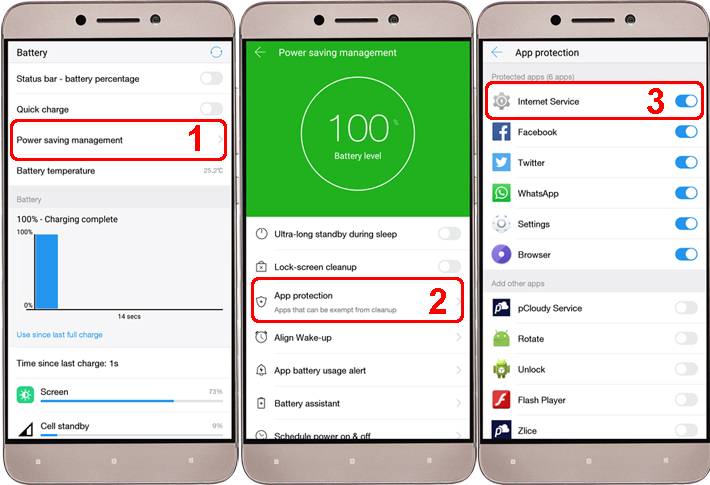 Set to “OFF” - System Settings > Battery > Power saving management > App protection > Internet Service (1,2,3)
